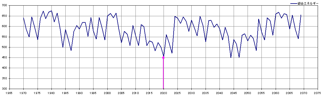 ②下のグラフは、数理法(陰陽五行により波動エネルギーを数値化する技法)により算出した、年毎の波動エネルギー数値をグラフ化したものです。